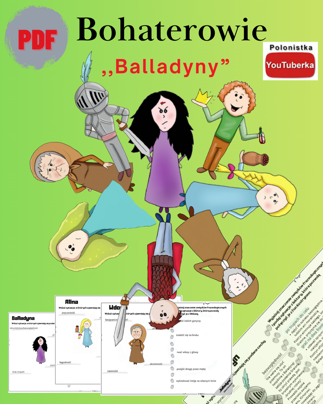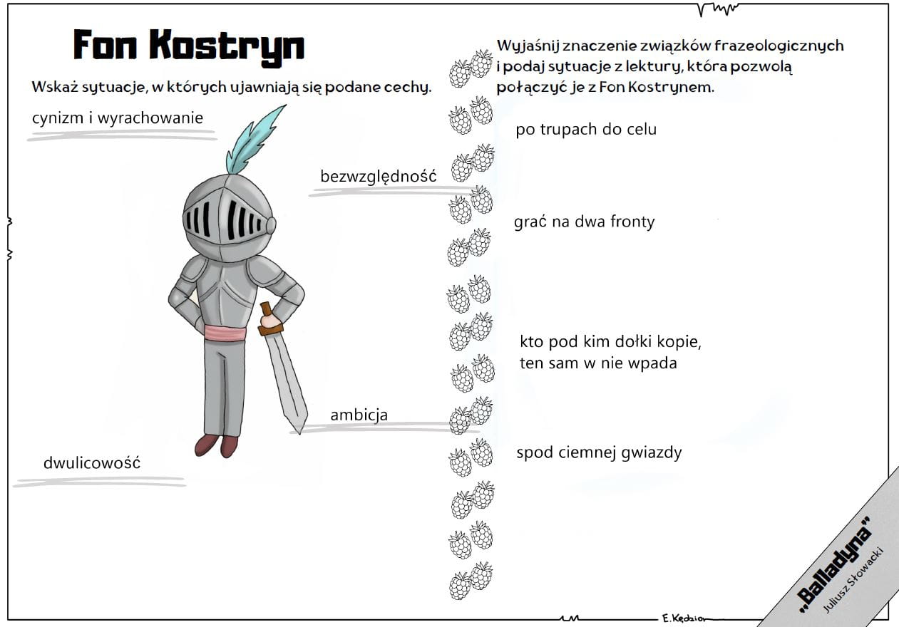 8 kart pracy (w wersji pustej, pokolorowanej i uzupełnionej) - każda z nich dotyczy jednego z bohaterów "Balladyny".