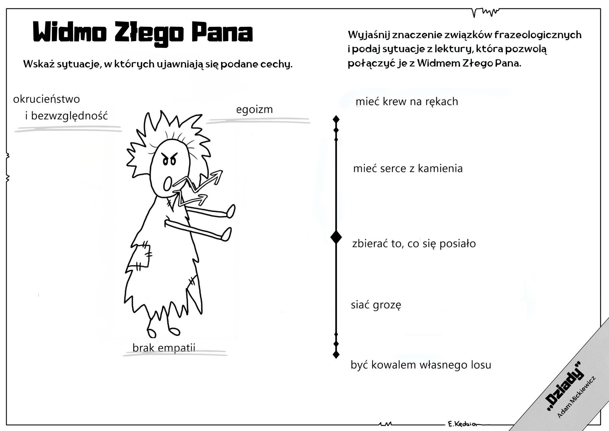 3 karty pracy (w wersji pustej, pokolorowanej i uzupełnionej) - każda z nich dotyczy jednego z bohaterów "Dziadów".